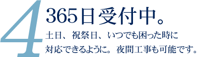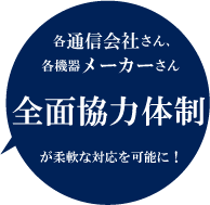 通信に関わる工事は、実際の業務に差支えが出るものも少なからず、”取付工事はお休みの日にしてほしい”。などのご要望に対応できるよう365日営業となりました。”ちょっと相談したい”などの事もいつでもお気軽にお電話ください。担当の者につながるようにさせて頂いております。